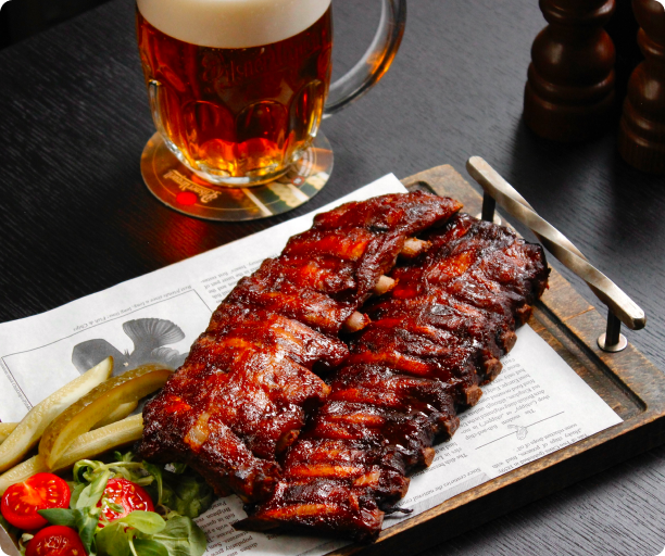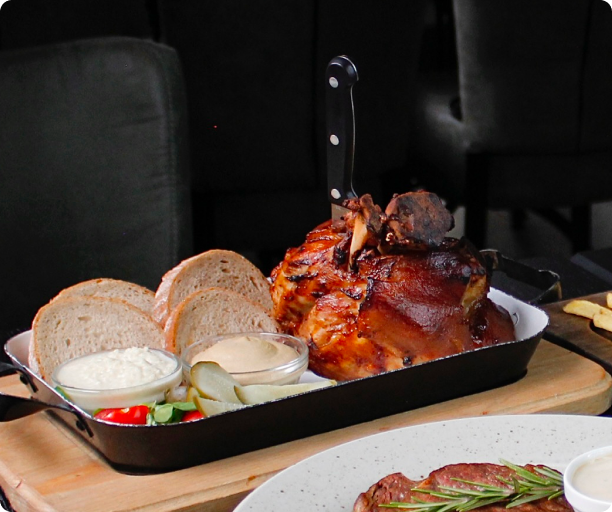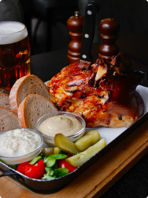 499 Kčmarinované v černém pivu, pomalu pečené do křupava, podávané s křenem,